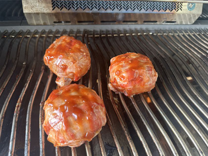 7. In den letzten 5–10 Minuten mit BBQ Sauce glasieren und fertig grillen, bis die Bombs glänzen und karamellisieren.