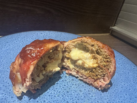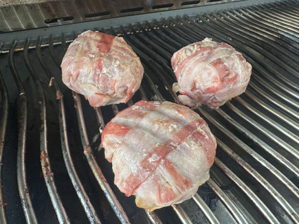6. Die Bombs bei 160–170 °C indirekt auf den Grill legen. Deckel zu und 60–90 Minuten grillen, bis das Hack durch ist (Kerntemperatur ca. 70C°) und der Bacon knusprig wird.