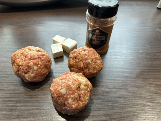 3. Hackfleisch mit Rub würzen, locker vermengen und in drei Portionen teilen.
