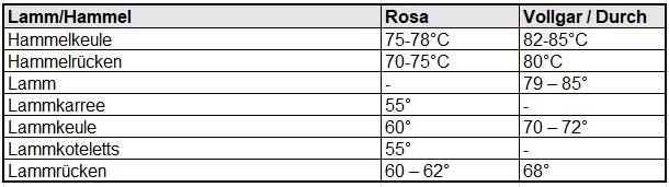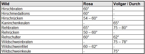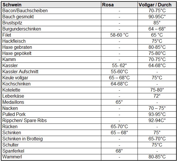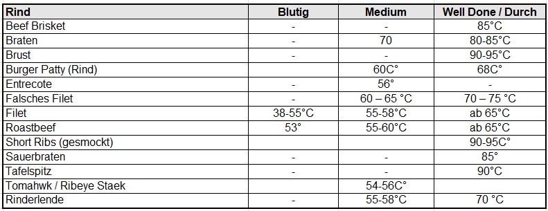 Eine zuverlässige Möglichkeit, um sicher zu gehen, dass das Grillergebnis wirklich lecker schmeckt, ist das Überwachen von Kerntemperatur mit Hilfe eines Grillthermometers. Hier findet ihr eine Liste der Kerntemperaturen von verschieden Gerichten.